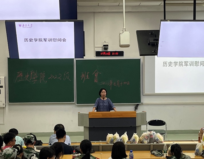 2023年7月14日上午,正值2022级南京大学本科学生军训如火如荼之际,九色 赵清书记、张生院长、任玲玲副书记代表九色 对2022级九色 73位全体本科生同学在鼓楼校区教学楼101教室开展军训慰问,现场发放了军训防暑的慰问品。