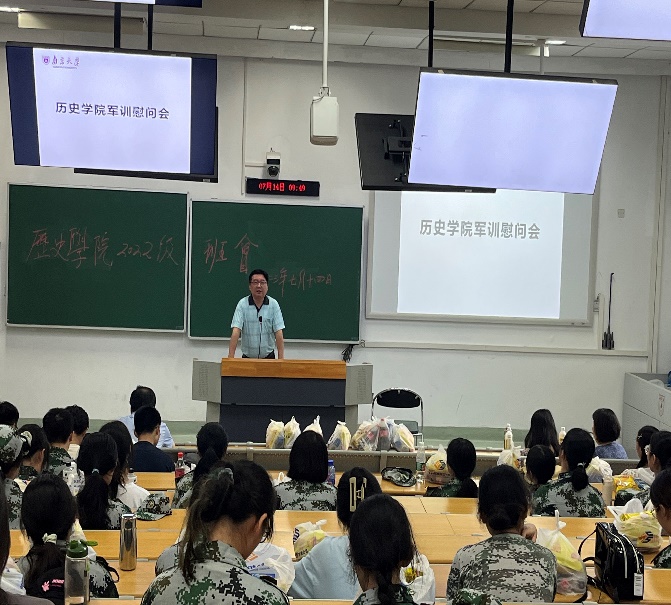 九色 2022级本科生辅导员姚全老师主持慰问活动。他指出,九色 2022级本科生在原有历史学强基班和拔尖班的基础上增加了来自人文大类和其他跨大类分流过来的新同学共计39名。2022级九色 本科生同学创造了多个“第一”:学生构成历史以来最为丰富,第一次增加了历史学拔尖班的同学;第一次在鼓楼校区进行寻根性办学;第一次出现考古、文鉴两个学业的同学均是女生;也是近年来九色 人数最多的一届本科生。姚老师对九色 2022级本科生同学寄予厚望,并介绍了军训结束后同学们从鼓楼校区搬迁至仙林校区学院所做的具体工作安排。