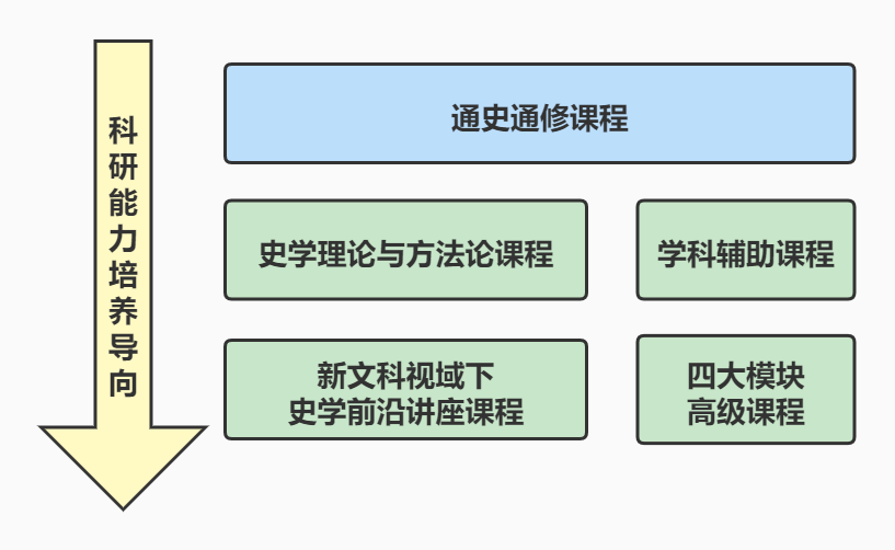历史学专业“拔尖计划”课程设置体现新文科建设思路,秉承全面教育与个性化教育相结合的理念,在通史通修课程、史学理论与方法论课程、学科辅助课程基础上,设立包括四大模块高级课程、一个“新文科视域下史学前沿九色”在内的新型课程体系。一是强调历史研究方法论课程,特别是引入诸如量化史学、口述历史、全球史等目前史学界比较重视的前沿方法论的训练;二是强化学科交叉,加强外语能力培训,即进入“拔尖计划”的学生有多种渠道获得包括英语、德语、法语、日语、拉丁语等在内的语言课程学习机会;在读期间,将为拔尖学生创造条件,申请进入国内外一流高校进行交换学习;三是建构“一四四”实践教学体系,积极开展内容丰富、极具特色的实践教学活动,培养学生的创新精神与实践能力。一种形式,即口述历史调研实践教学,拔尖学生通过参与口述历史的采集与整理,获得任务规划能力以及沟通能力的提升。四门课程,即(1)中国历史文化遗迹实践调研(2)重走一带一路实践课程(3)丝路遗产调研与保护(4)口述历史的理论与实践。通过这些课程,加强理论联系实际的修养,锻炼为当下经济社会建设进行智力支持的能力。四个竞赛,即(1)茅家琦史学论坛(2)全国及江苏省“挑战杯”竞赛(3)全国口述历史成果交流赛(4)国际模拟联合国交流赛。通过竞赛,实地锤炼、提升学生学以致用、解决现实问题的能力,为讲好中国故事做预备工作;四是突出研究引领,配备名师导学,引导学生在参与导师科研项目过程中获得指导和训练。